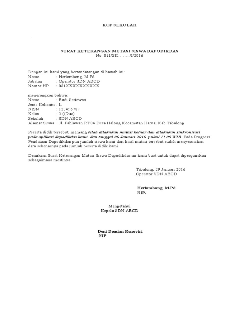 Contoh Surat Mutasi Dah Peserta Didik Dapodik