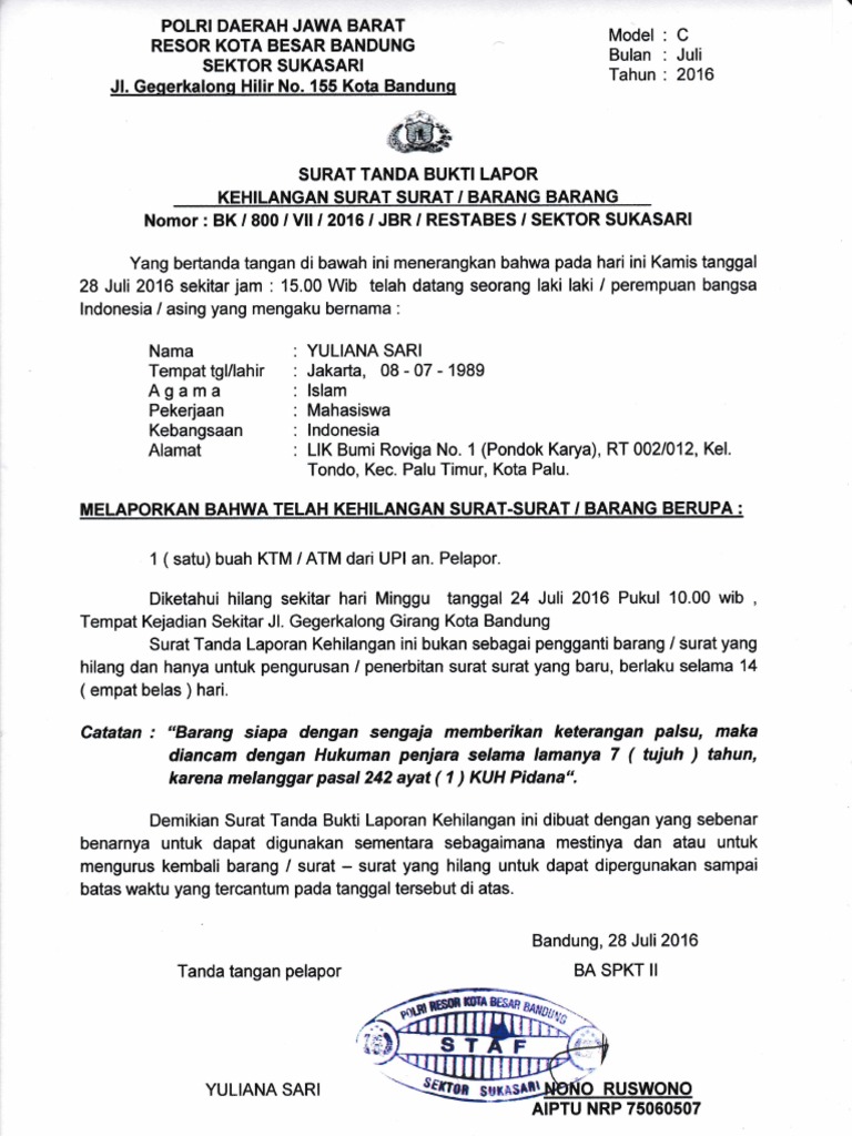 Contoh Surat Tanda Bukti Lapor Kehilangan Surat Barang Dari Kepolisian