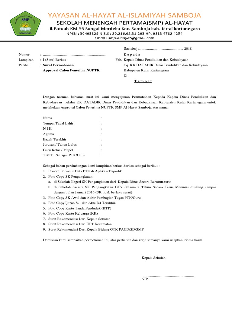 Surat Pengajuan Nuptk Dari Kepala Sekolah